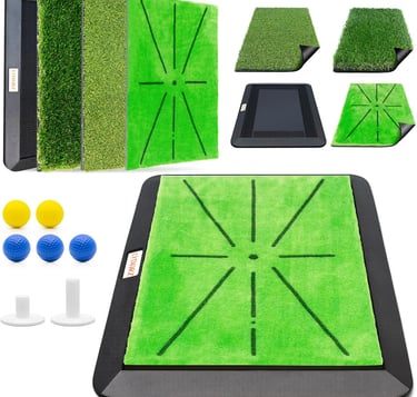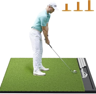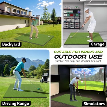 Versatile and Convenient: Its heavy-duty construction provides maximum stability on various surfaces (concrete, grass, etc.) and is suitable for all weather conditions, from backyard to garage or simulator use. The large 5x4ft or 5x5ft size provides a spacious hitting area for all stance adjustments and includes multiple tee positions for left- and right-handed golfers.