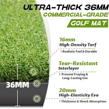 Superior Shock Absorption: The mat features an ultra-thick 36mm cushioning system (16mm dense turf + 20mm high-elasticity EVA pad), which absorbs over 90% of ground impact. This protection is key to safeguarding your clubs and reducing stress on your joints and muscles, which is a common concern with thinner mats.