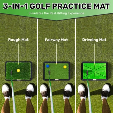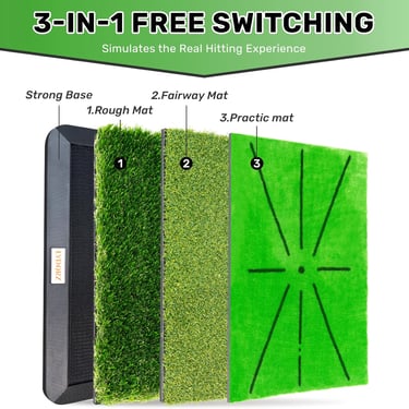 Versatile 3-in-1 Design: This set includes three different, replaceable turf mats—fairway turf, rough turf, and a divot board mat—all fitting into a single, heavy-duty rubber base. This versatility allows you to simulate a variety of golf conditions and practice different types of shots, from driving off the fairway to escaping the rough.